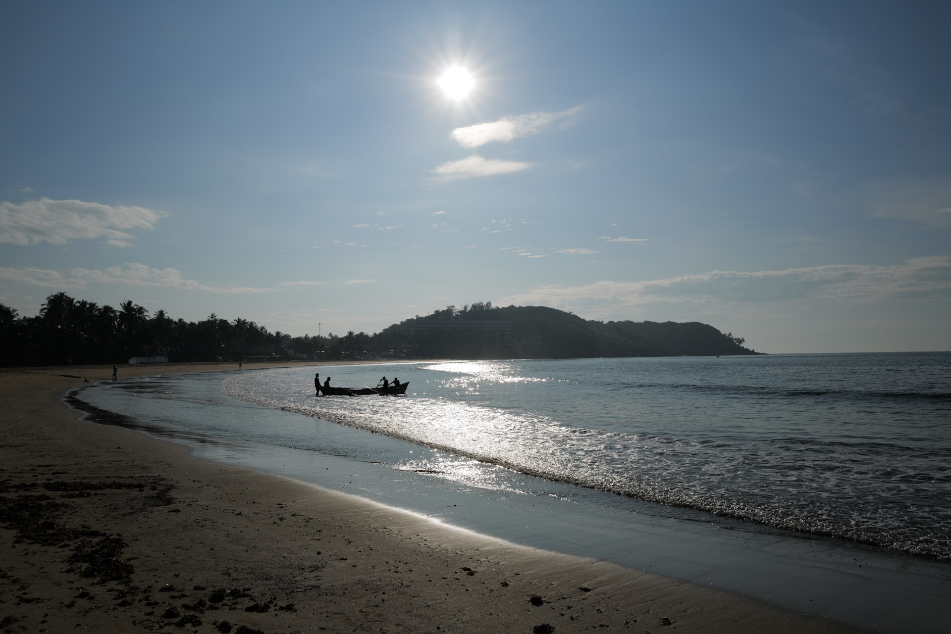Erfrischende 26°C lassen den Jogger auf dem Strand kräftig schwitzen. Während dessen schreitet Dananjay in aller Ruhe das Ufer des Arabischen Meers ab – seine Morgenroutine. Ich ziehe mich an und eile mit meiner Kamera hinunter zum Strand. So blau waren Himmel und Meer seit meiner Ankunft in Goa nicht.