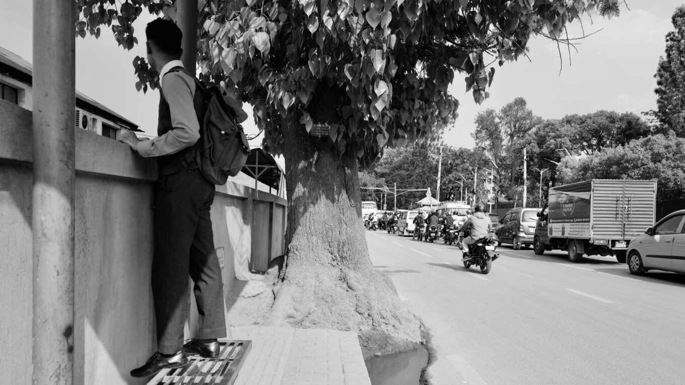 Kathmandu, an April afternoon. The city is noisy, as it always is – with the fervour of a place that has to reassert itself every day. Motorised scooters whizz by, buses spew smoke, honking horns negotiate right of way. And at the edge of this hustle and bustle stands a young man in school uniform. Not in a hurry, not distracted – just there.