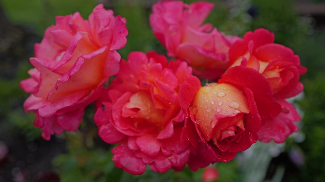 Unser Auto hat über Nacht seine Akkus geladen. Um sieben Uhr standen wir auf: waschen, frühstücken, Kühlschrank ausräumen, die Vögel ein letztes Mal vor der Reise füttern und die mit Regentropfen benetzten Blumen im Garten bestaunen.