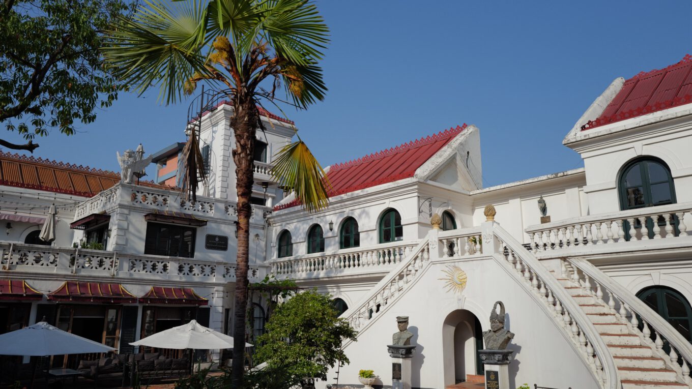 What looks from the outside like a plastered annex from the British Raj era reveals itself inside as a cultural oasis with a royal patina: white facades, tiled roofs, intricately carved wooden doors and windows. The whole place feels like it’s slipped out of time. Visitors stroll between galleries, upscale boutiques, and elegant restaurants—dressed in designer clothes that easily cost more than a teacher’s monthly salary.